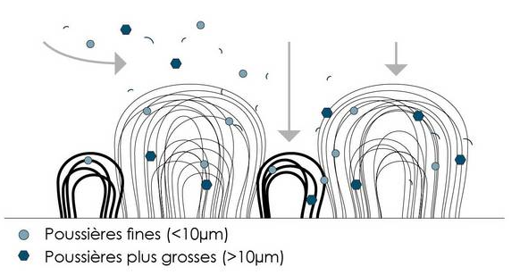 Le produit capture les poussières fines, sans additif chimique, en faisant appel à une solution mécanique dans la structure de la moquette. La boucle haute est constituée de filaments de fil fin qui capturent et retiennent la matière particulaire la plus petite (< 10 μm).
