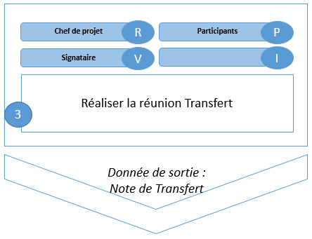 « La réunion de transfert doit être concomitante ou très proche de la mobilisation de l'équipe travaux. Elle permet une présentation du projet, de ses enjeux, de son coût, des contrats ou marchés ainsi que du dispositif juridique et financier pour les projets complexes.Le transfert doit être également l'occasion d'un nouvel examen des risques et des opportunités du projet sous l'angle de son exécution.