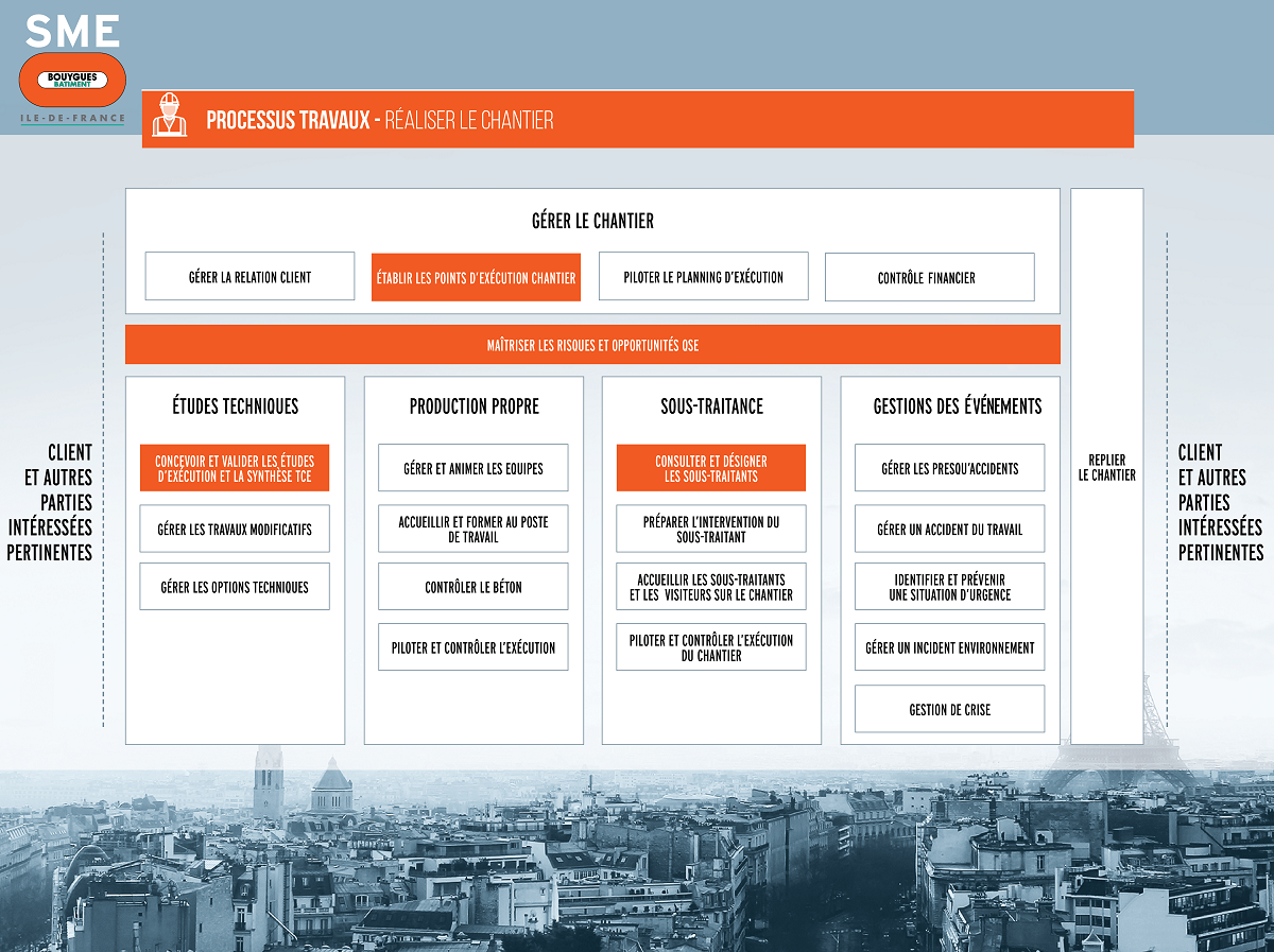 Gerer la relation clientPiloter le planning d'executionContrôle budgetaireConcevoir et valider les étudesGérer les travaux modificatifsGérer les options techniquesGérer et animer les équipesAccueilir et former au poste de travailControler le betonPiloter et controler l'exeConsulter et désigner les sous-traitantsPreparer l'intervention du sous-traitantAccueillir les sous-traitant et les visiteurs sur le chantierPiloter et controler l'exe du chantierMaitriser les risques et opportunités QSEReplier le chantierEtablir les points d'exe chantierGérer les presqu'accidentsGérer un accident du travailIdentifier et prévenir une situation d'urgenceGérer un incident environnementGestion de crise